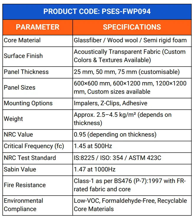 Product Code & Specifications – PackSound EchoStop™ Fabric Wrapped Panels