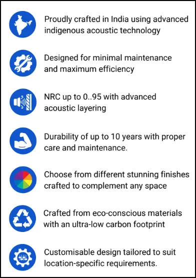 EchoStop™ acoustic panels are designed to deliver superior performance, longevity, and sustainability. Proudly made in India with advanced indigenous technology, these panels offer high NRC ratings (up to 0.95), minimal maintenance, and up to 10 years of durability. With eco-conscious materials, customizable design options, and a wide range of premium finishes, EchoStop™ panels are ideal for enhancing both acoustics and aesthetics in any interior space.