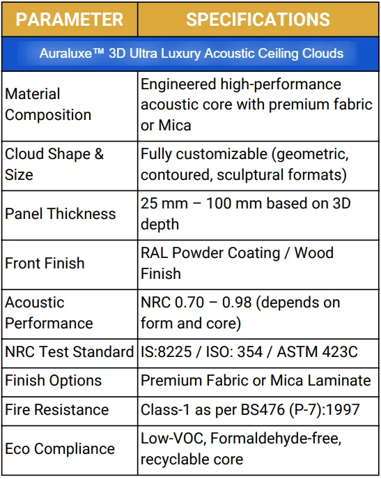 Auraluxe™ 3D Ultra Luxury Acoustic Ceiling Clouds elevate interiors with a seamless blend of high-end design and superior acoustic performance. These suspended panels absorb sound efficiently while creating striking 3D visual effects, perfect for luxury residences, auditoriums, hotels, and corporate spaces.