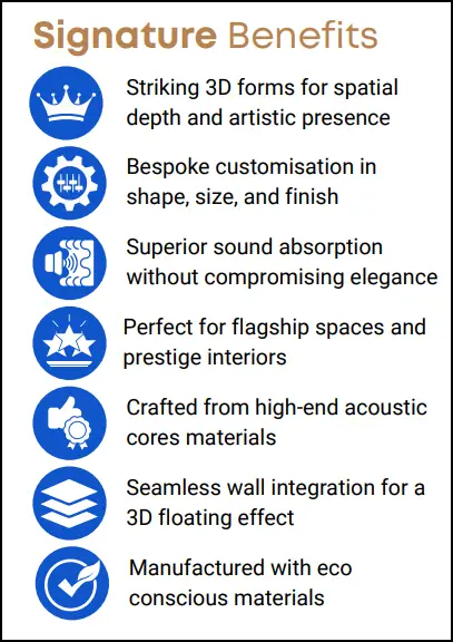 Crafted with premium acoustic materials, Auraluxe™ panels provide exceptional noise absorption, fire safety, and structural stability, making them ideal for upscale interiors that demand both beauty and functionality.